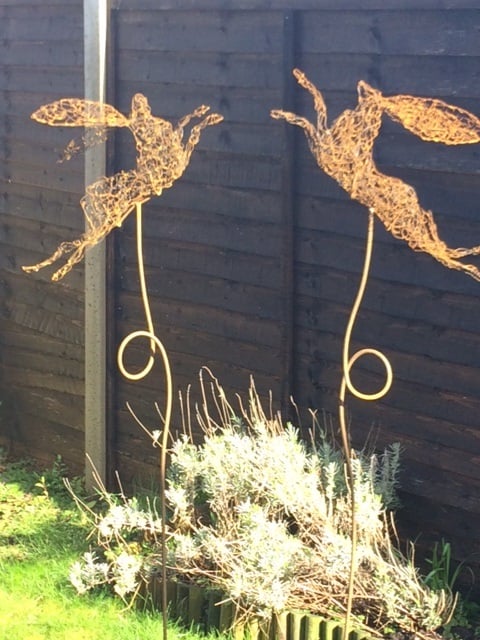 I used to think that boxing hares were both male, in pursuit of a female. But in fact, it's a male and a female. The male having chased the doe all over the countryside, gets short shrift from an understandably fed up doe. Regardless it's a wonderful spectacle to behold in the spring, and an iconic pose to capture in wire.